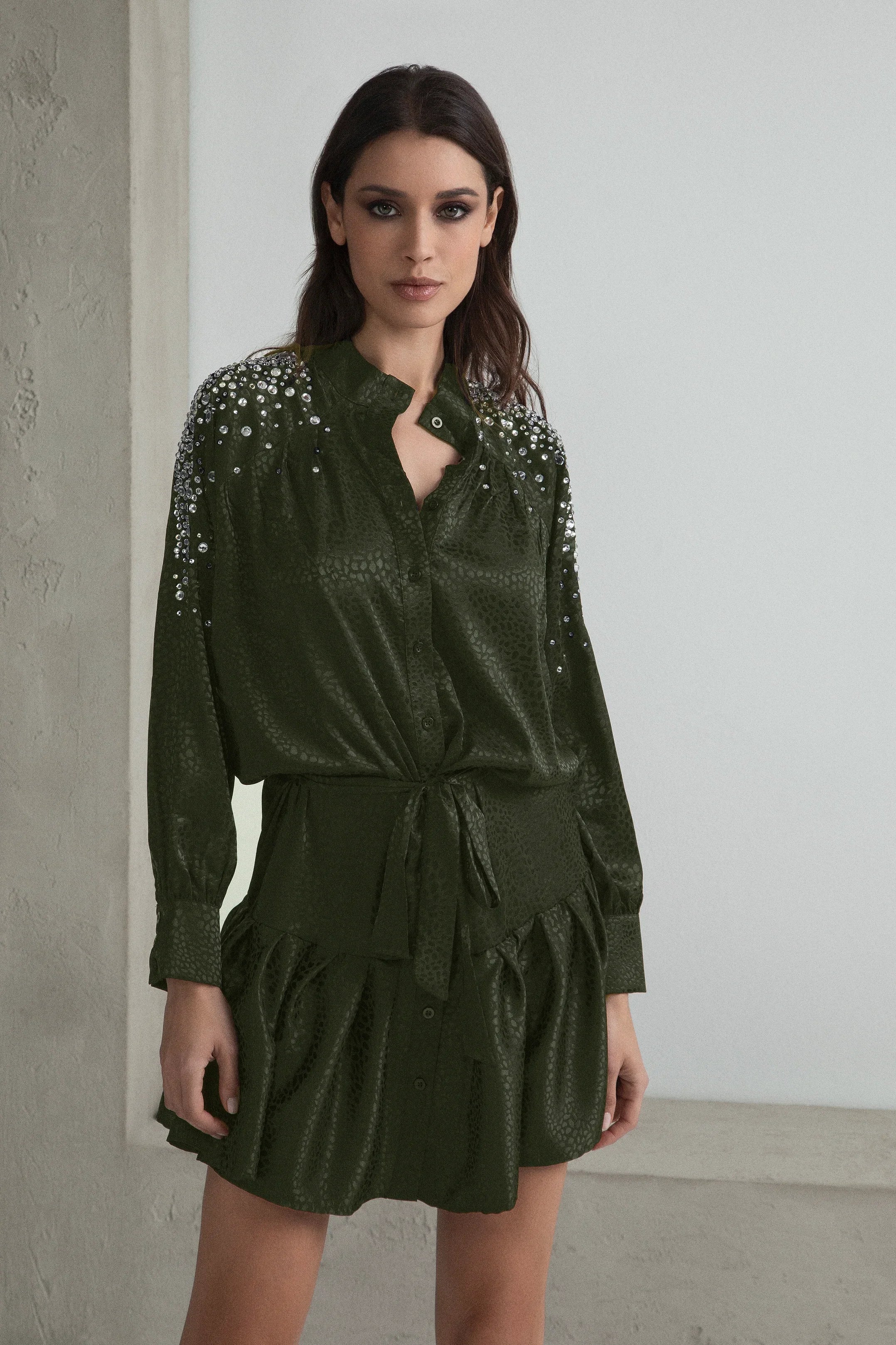 CHEMISIER DRESS WITH RHINESTONE WRAP SKIRT AND BELT