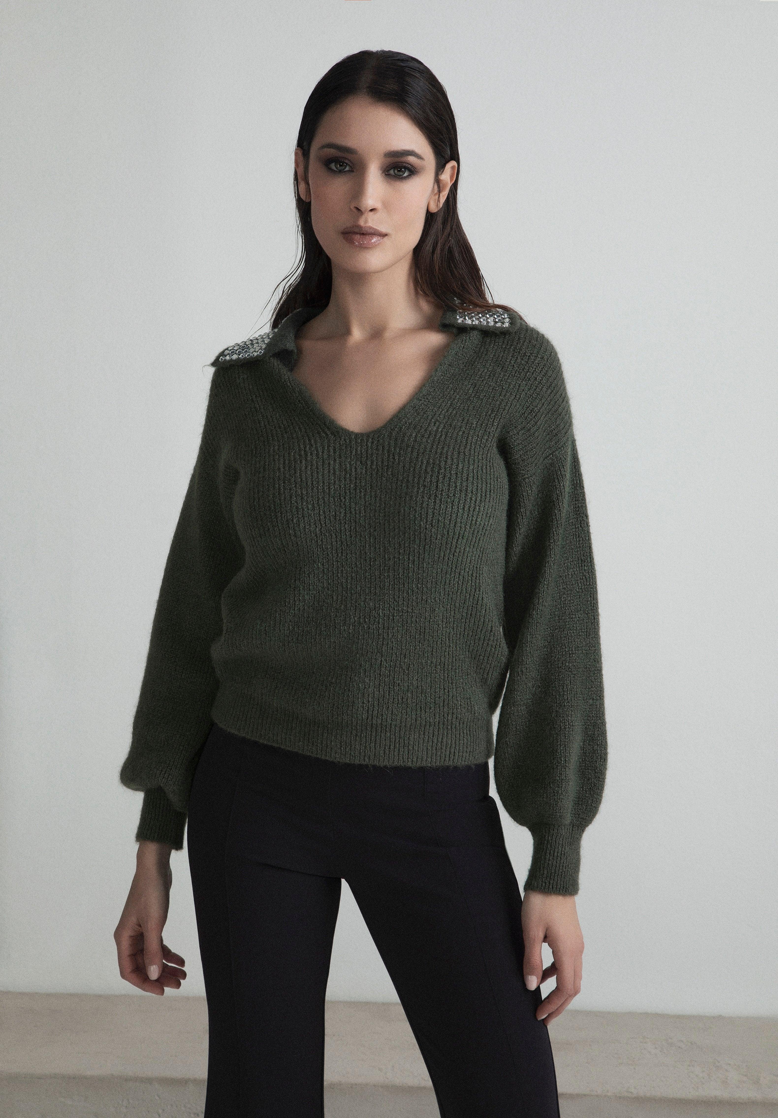 MOHAIR MIXED POLO STYLE SWEATER WITH RHINESTONE ON THE NECK