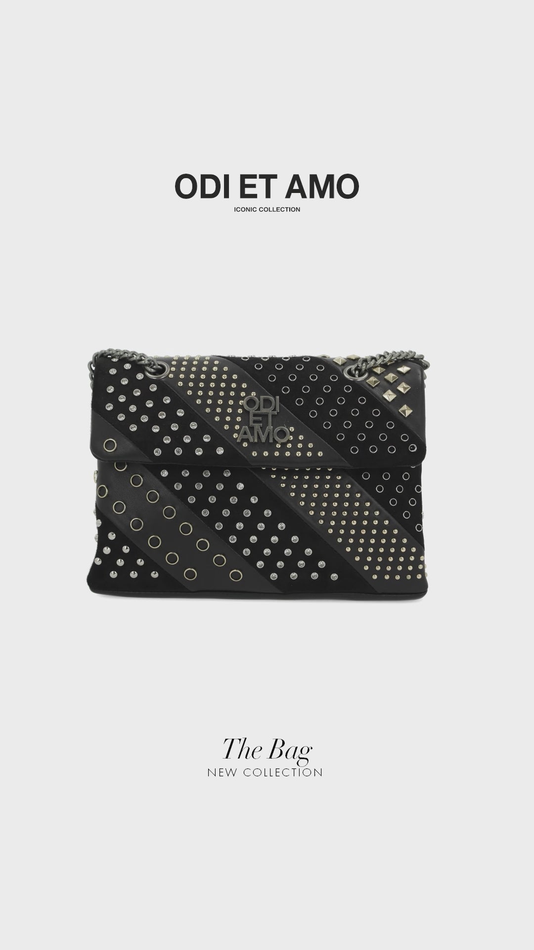 Borsa dalle vibes rock presenta un esterno nero in tessuto in un design a righe diagonali cucite con un mix and match di borchie di diverso genere.