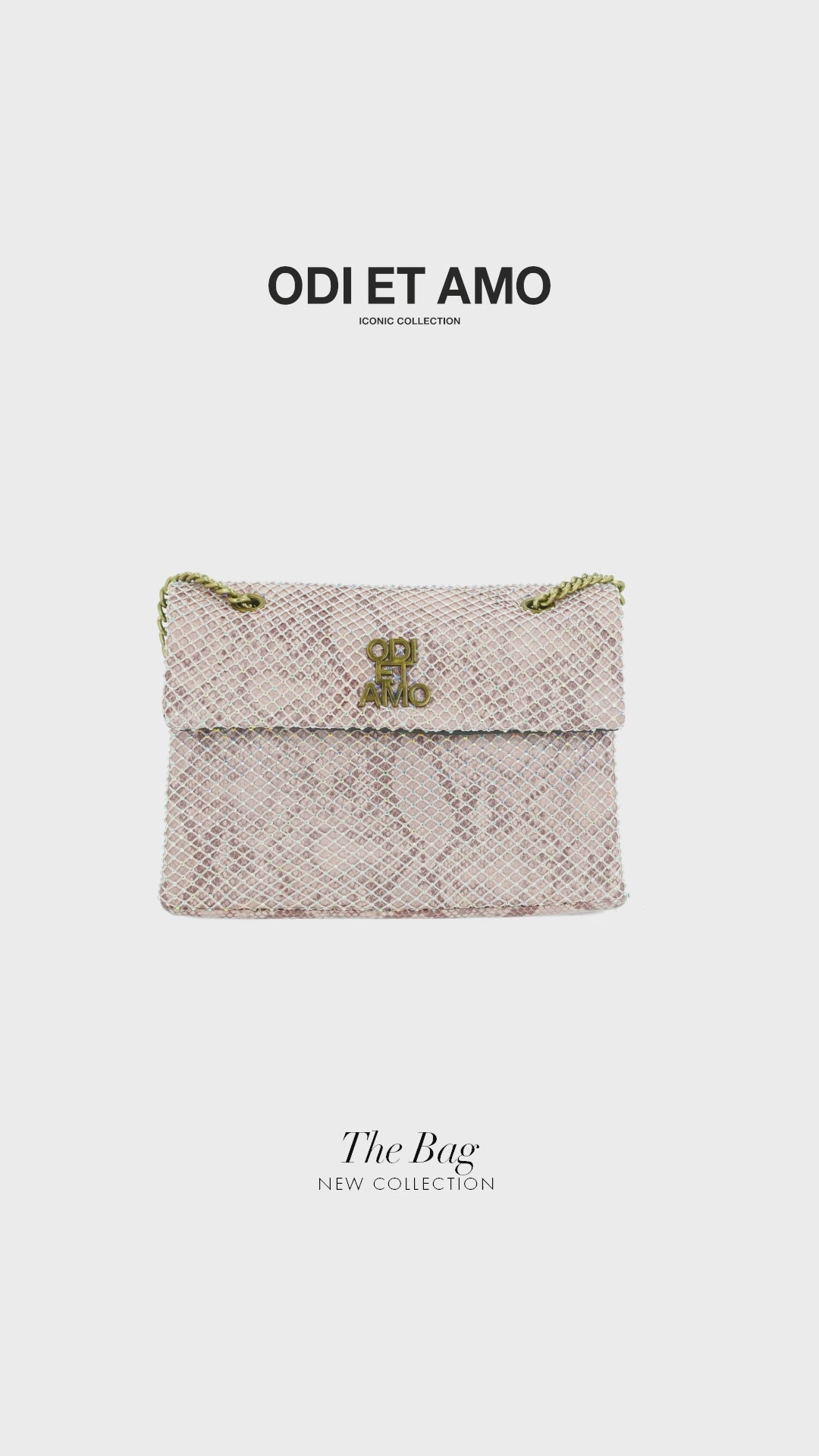 Borsa realizzata in ecopelle con applicazione retina in lurex sui toni del rosa con una texture pitonata.