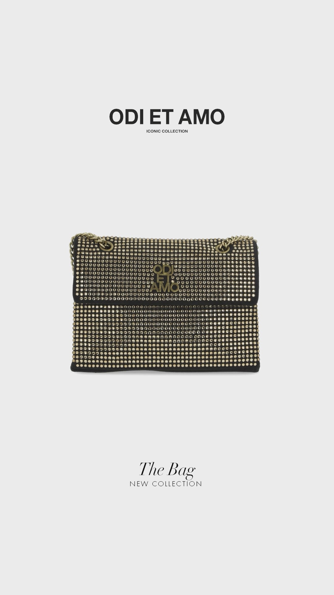 Borsa a tracolla realizzata in tessuto impreziosito da cristalli dorati creando un gioco di luce che attirerà subito l'attenzione.