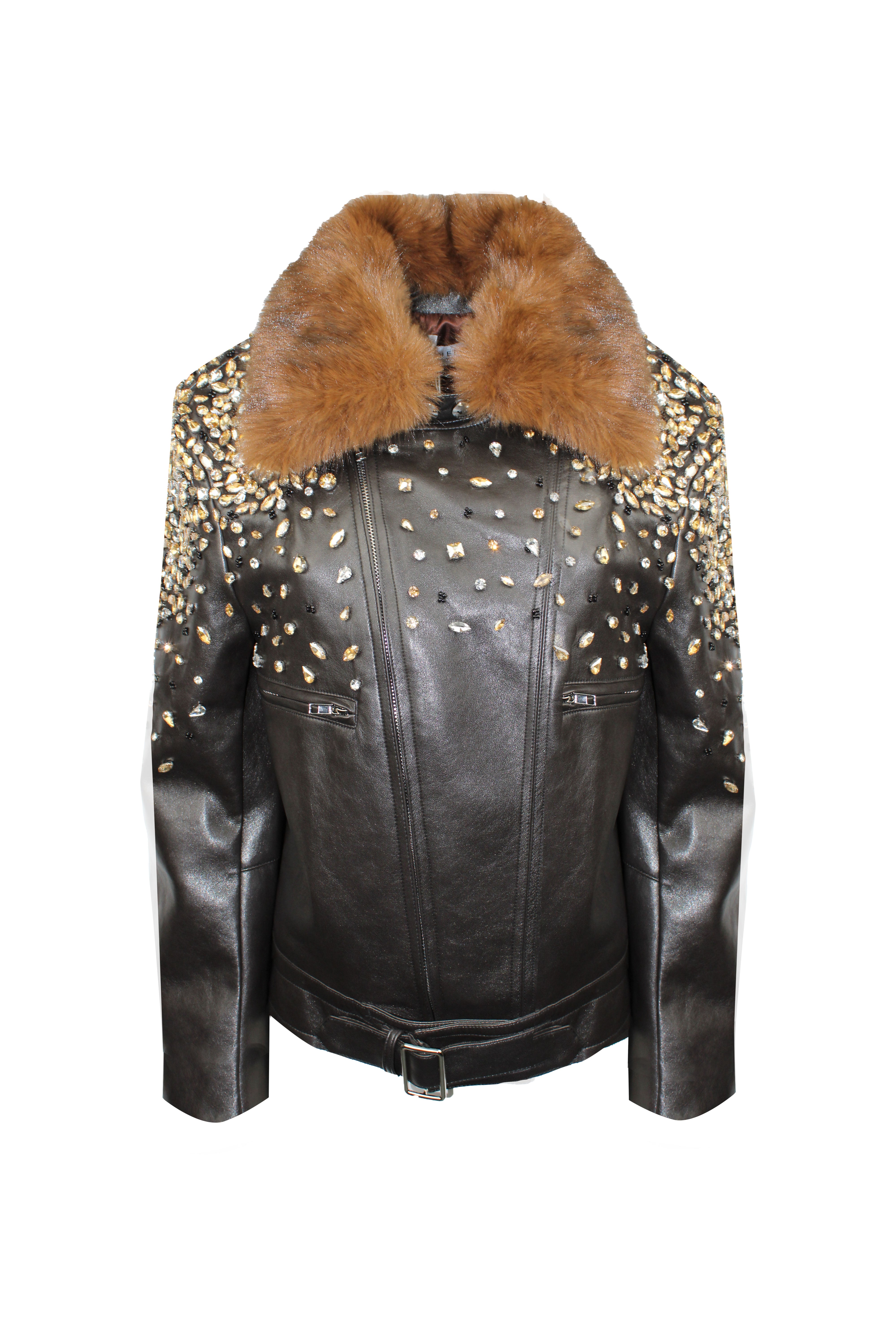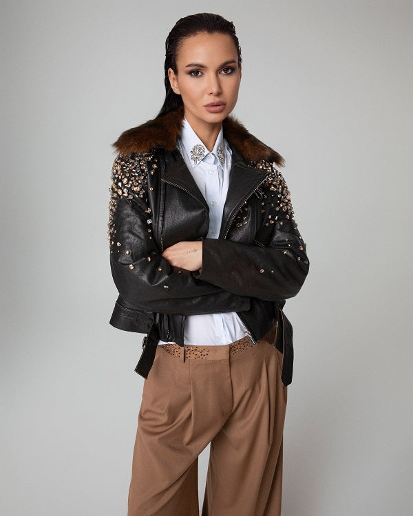 ECO-LEATHER JACKET WITH HAND-EMBROIDERED STONES AND RHINESTONES