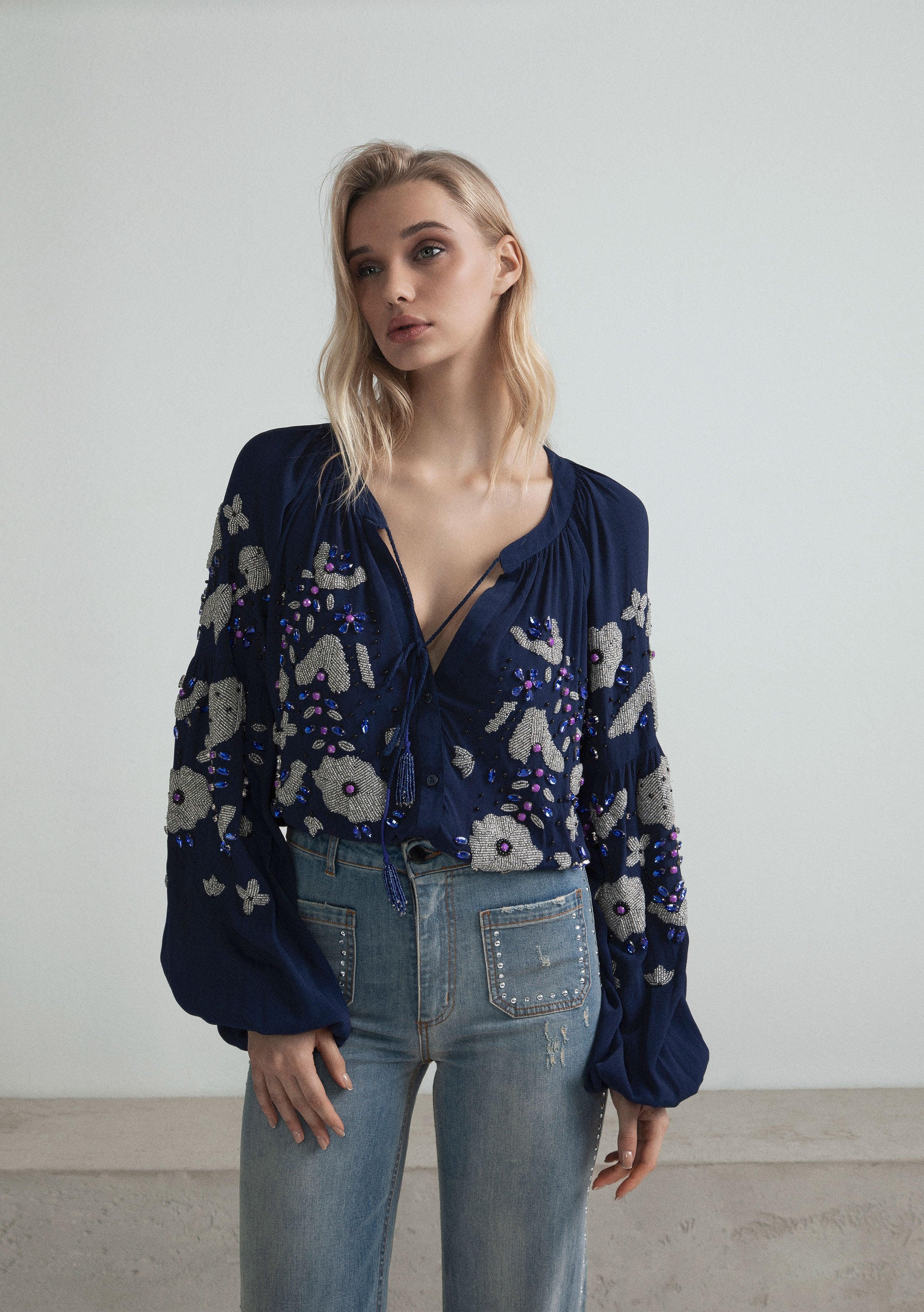 BLUSA RICAMATA A MANO CON CRISTALLI COLORATI E NAPPINE