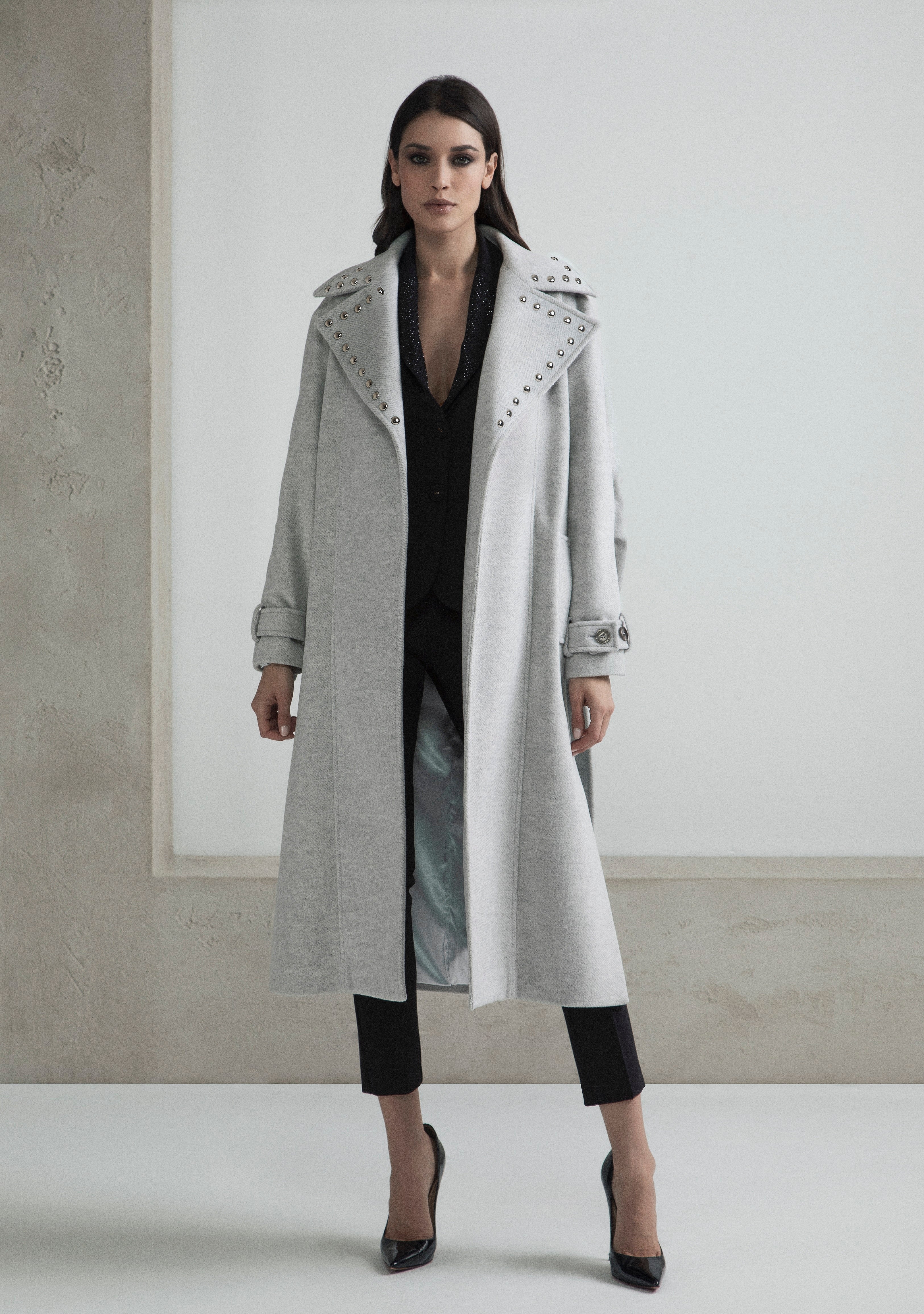 Taglio lungo Chiusura doppiopetto Cintura da annodare con passanti Tasche a filetto Spacco con bottoni Applicazione borchie lungo il rever... Per saperne di più